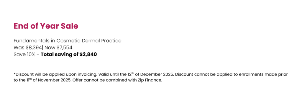 | Fundamentals in Cosmetic Dermal Practice July | 13/07/2026 | 15/07/2026 | $8,394.00 |